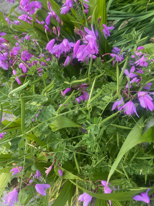 よく咲いている紫蘭の花々にカラスノエンドウの実もかわいい。
