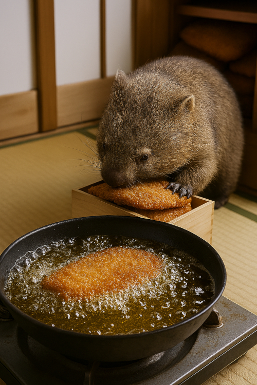 おしカツ 投稿日時: 2025年11月10日 投稿者: rinzo 返信 「おしカツ」ということで、ウォンバットが和室でトンカツを揚げて、箱や押し入れに詰めている動画を作った。ぎゅうぎゅう押しているところは、意味がわからないところなのだが、文字で補った。下の画像は動画の基になった画像。 下は今日アップロードした朗読ファイル。