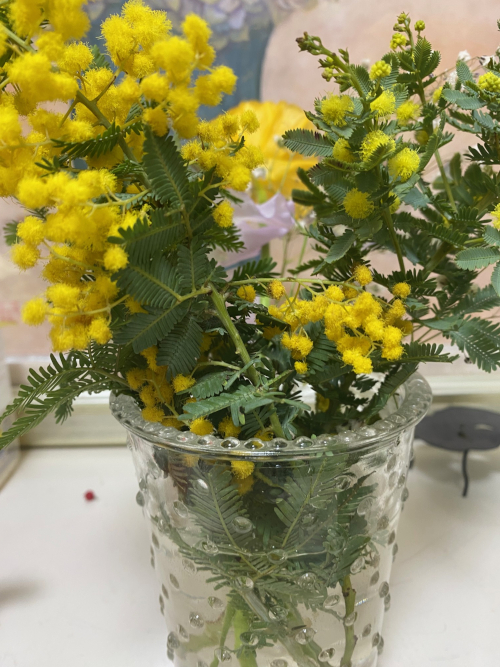 近所ではミモザが目につく。ウチにもミモザの生け花。
