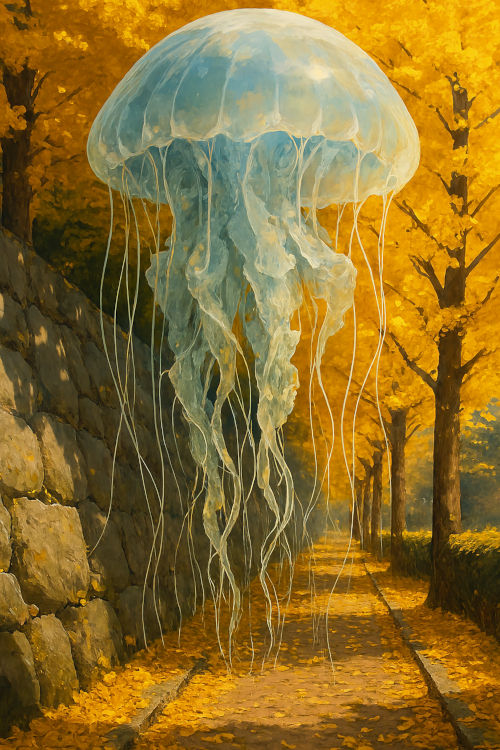 秋のクラゲ 投稿日時: 2025年10月25日 投稿者: rinzo 返信 紅葉の並木道にクラゲを浮かべてみたが、なんとなくインパクトがない。AIはやりとりの中で作ったものから学習して、記憶に残していき、その残滓が現れることがある。そういう学習の過程が出てきたほうがいいような気がする。 上は、今日アップロードした朗読ファイル。